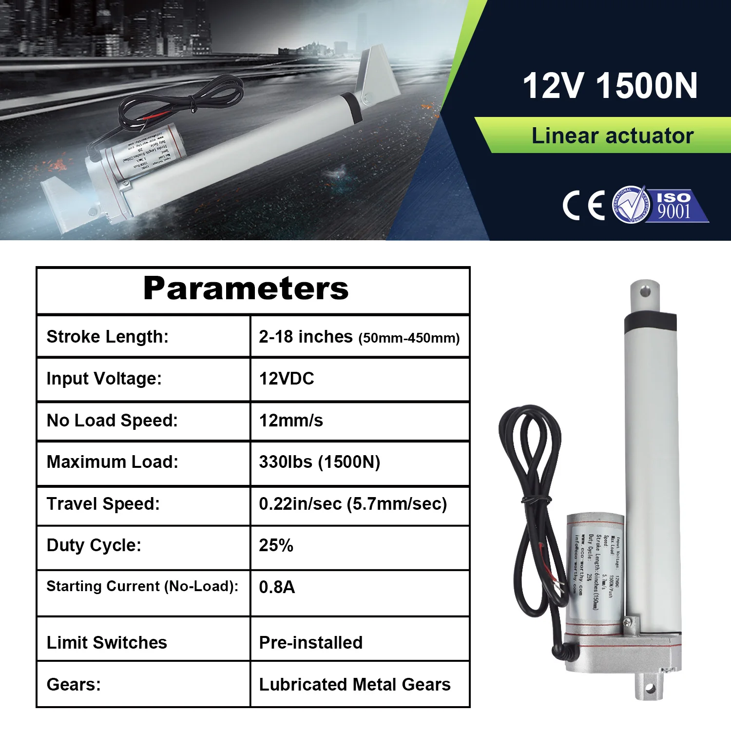 Inch Stroke Linear Actuator 1500N330lbs Pound Max Lift 12V with Brackets. 12V Stroke Lifter Electric Putter Rod 6000N1320LBS Motor Linear Actuator 224Linear Actuator Max Lift Stroke Electric Motor Stroke Heavy Duty Linear Actuator for Medical Auto Car 450mm 18inch 8299. PA-14P-2-150 38 out of 5 stars 26.